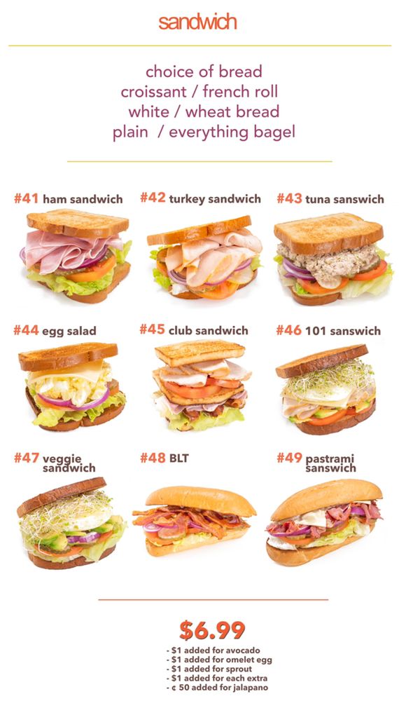 Ham nestled between your choice of croissant, French roll, white, wheat bread, or bagels (plain/everything).