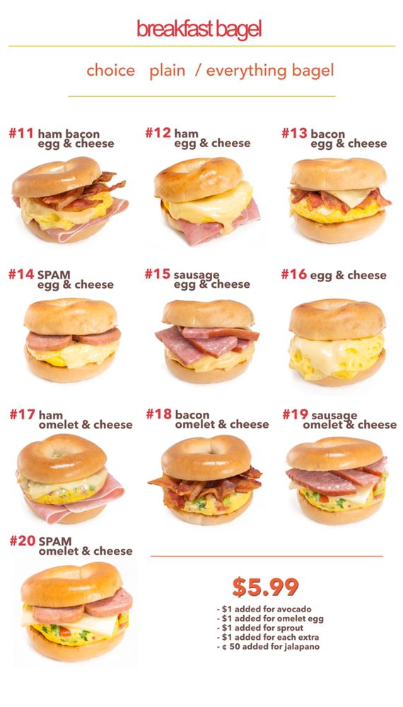 Spam, omelet, and cheese on your choice of plain or everything bagel.